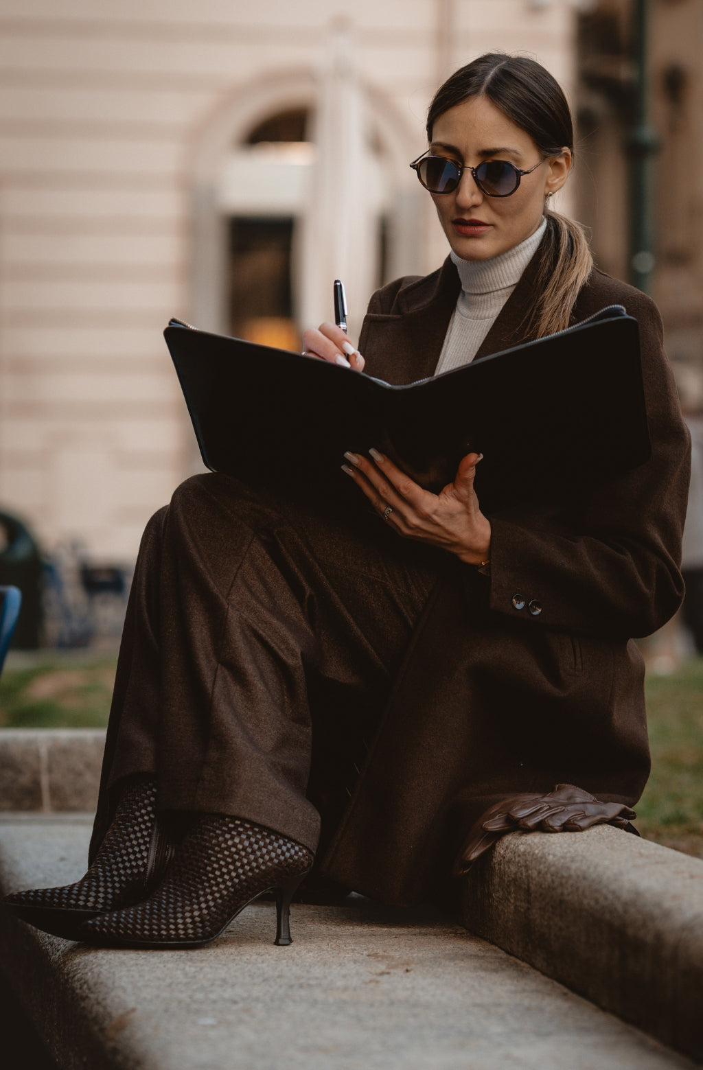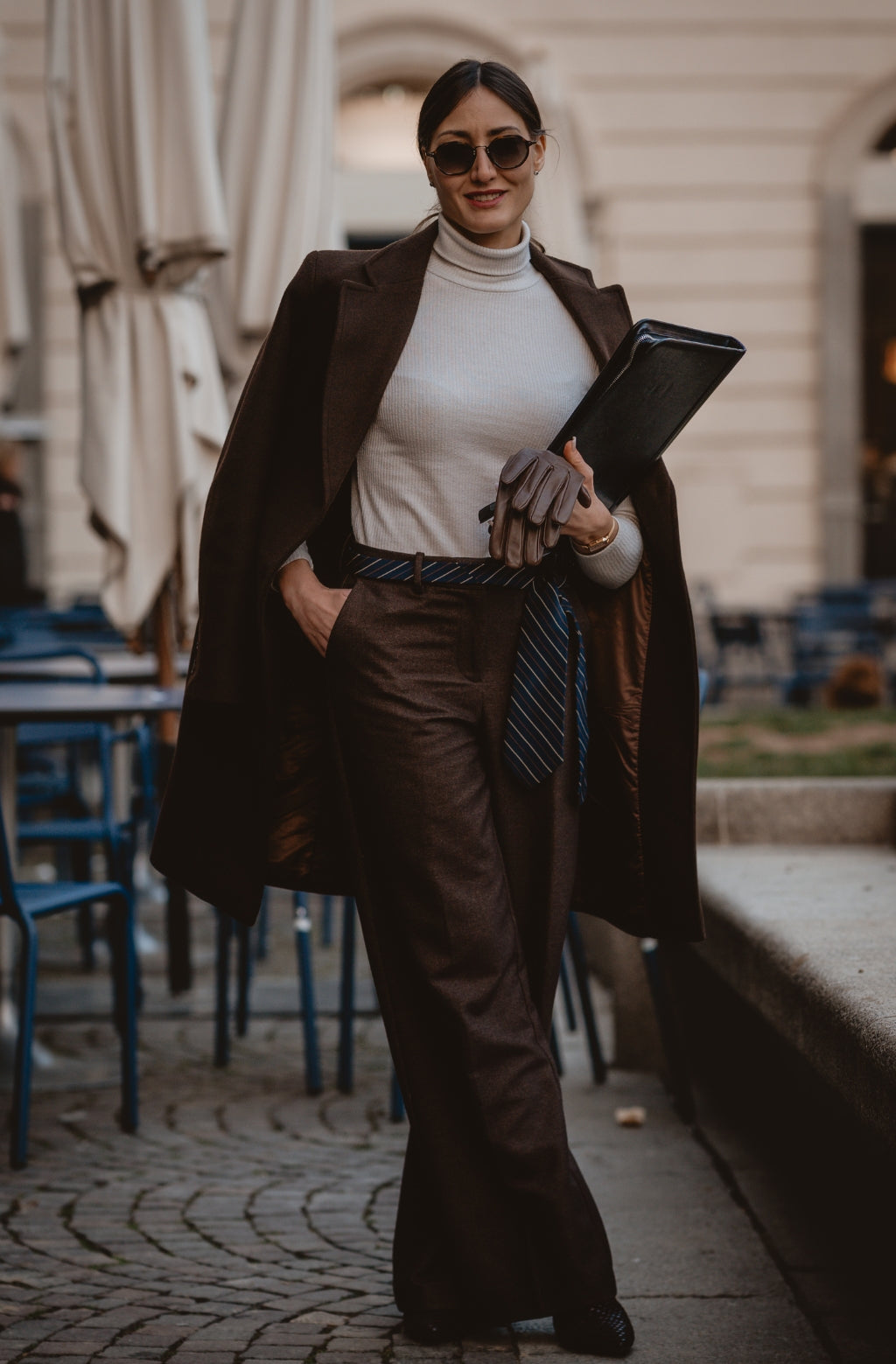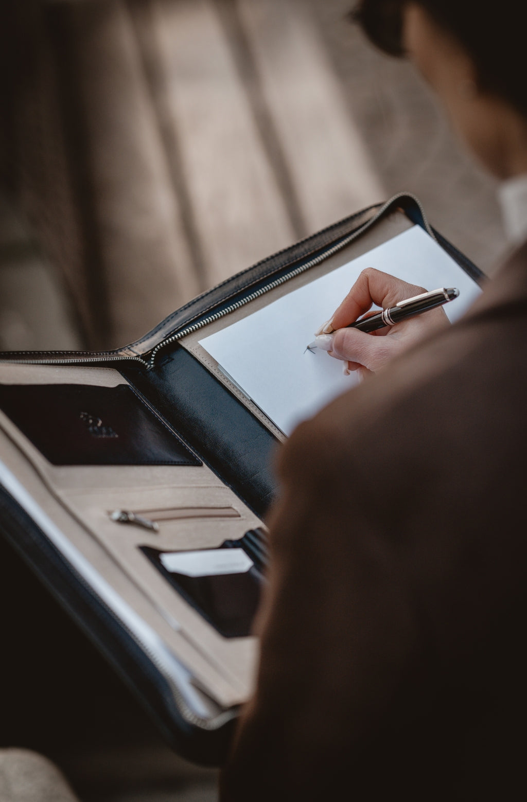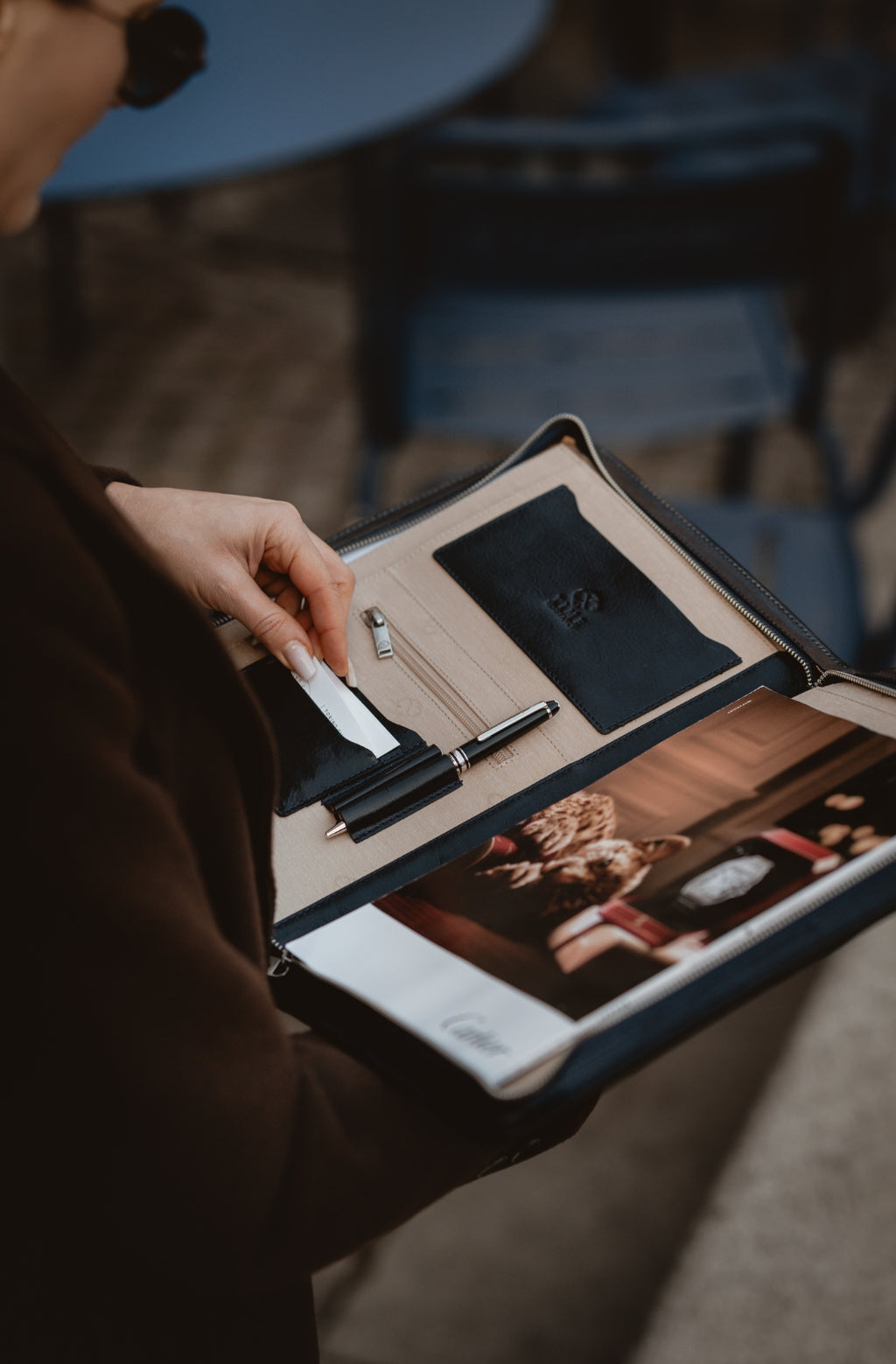 A solid full-grain leather documents folder that will complete a sleek minimalist business look. To organize your files and digital devices but keep a light, effortless chic appearance.