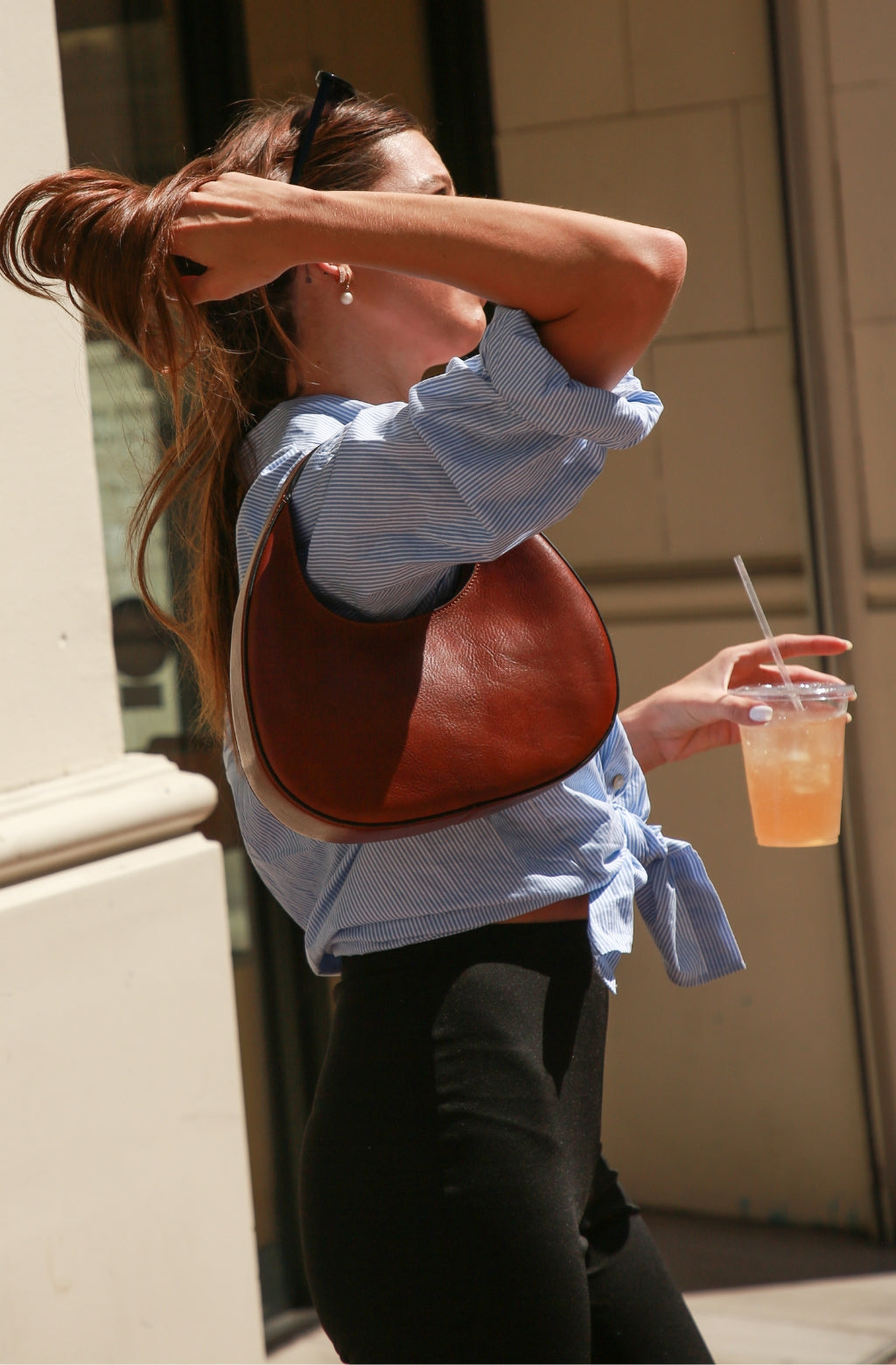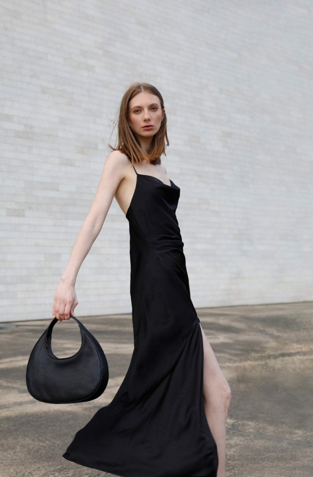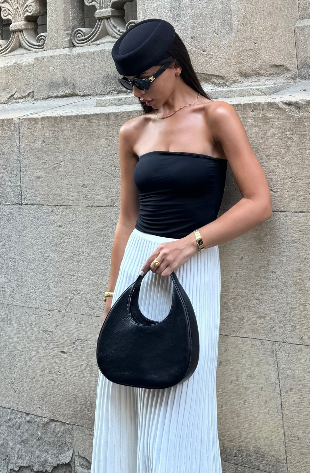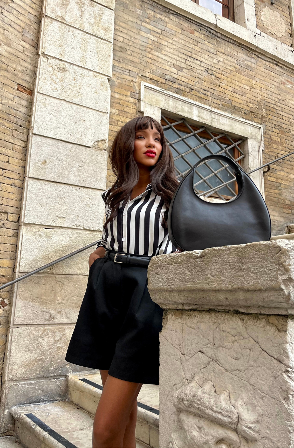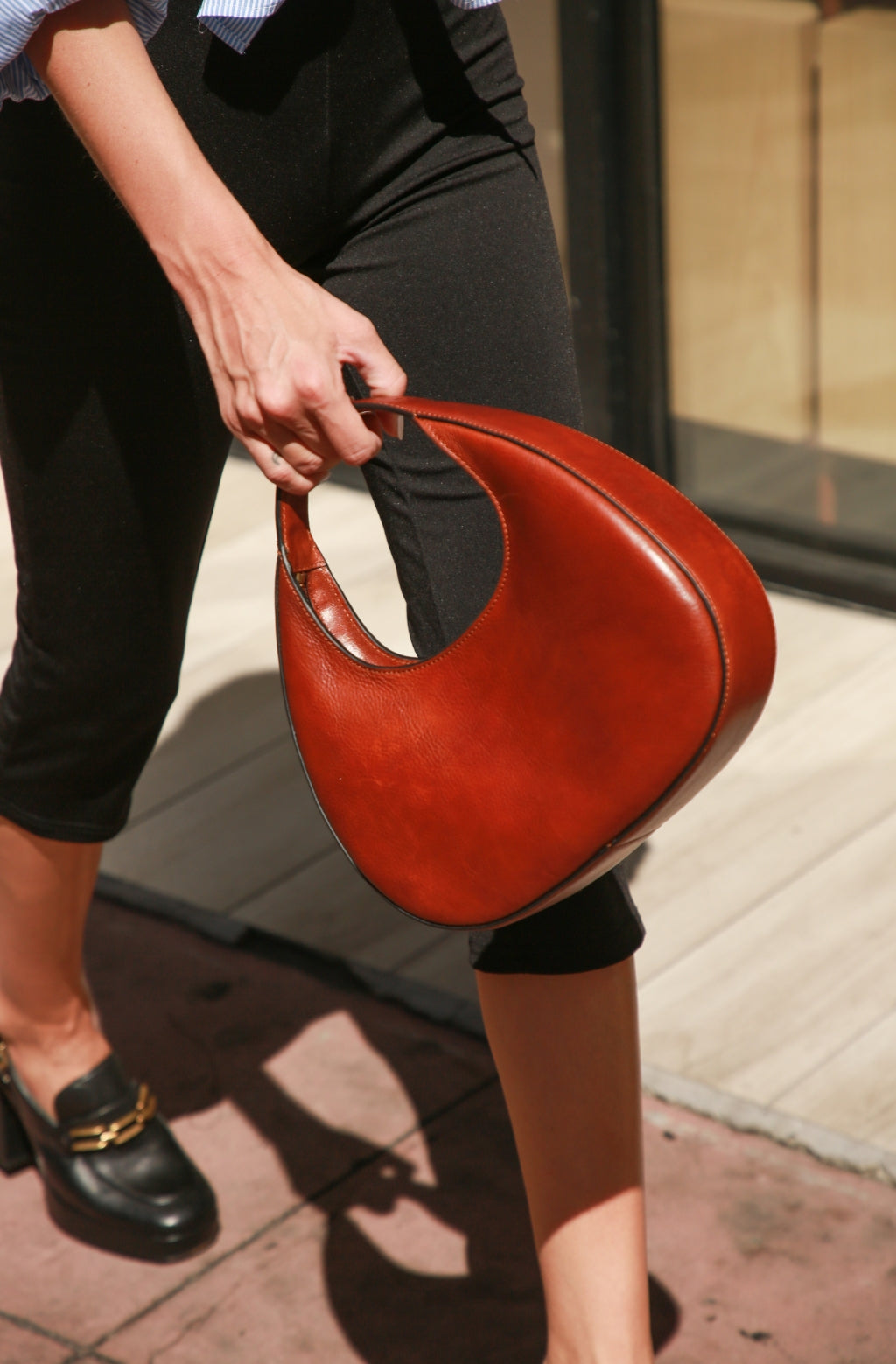Introducing "The Moonstone" leather handbag, a celestial-inspired accessory that captures the essence of timeless elegance. Crafted with precision, its small, rounded shape evokes tranquil beauty, while the round handle adds a touch of grace. Designed to be cradled in your arm with its compact size, it exudes an aura of effortless sophistication. The zip closure ensures your belongings are securely tucked away, while the sleek minimal design speaks volumes of refined taste. Adorned with the Time Resistance logo on the handle, it's a symbol of quality craftsmanship and enduring style. Illuminate your ensemble with "The" Handbag—an embodiment of celestial allure and understated refinement.