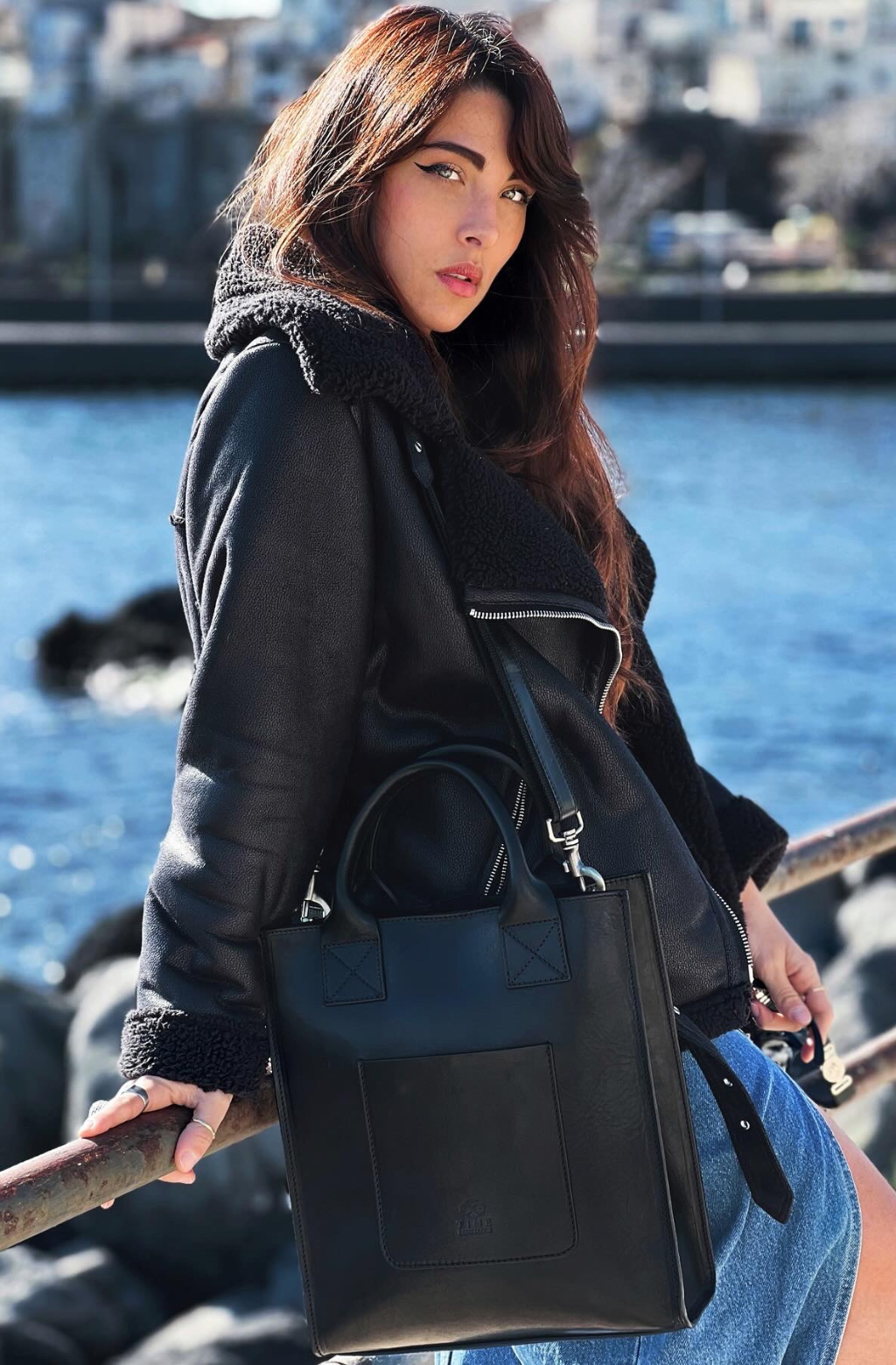 A simple and elegant leather tote bag adds character and style to every self-confident woman! Its universal look allows you to use the tote bag for various purposes. One may take the bag to the work, shopping, meeting, or walk and feel comfortable with it in any condition!