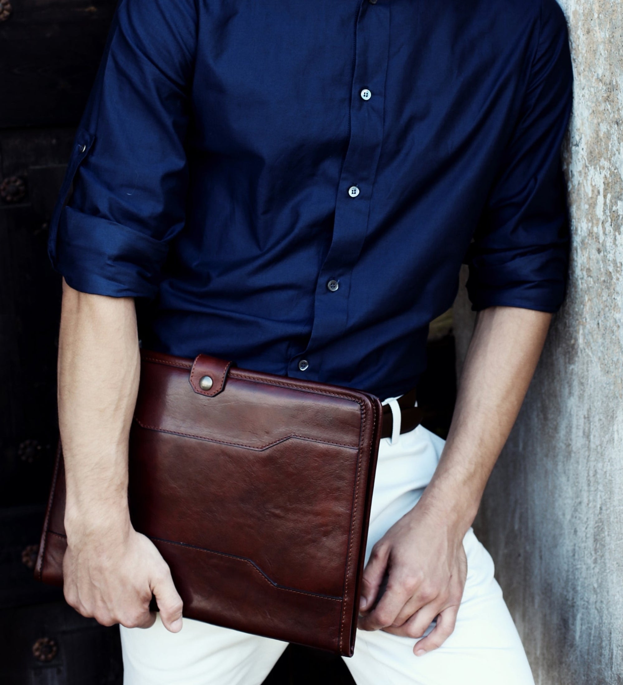 Italian leather business portfolio provides you to store important documents and files in style. Featuring holders for laptop/tablet, credit/business cards, pens, headphones/cables, legal pad, coins, cellphones, etc. Finished with a secure closing leather strap, this sophisticated yet practical business accessory helps you to be flexible, mobile and most importantly ready to advance your career.