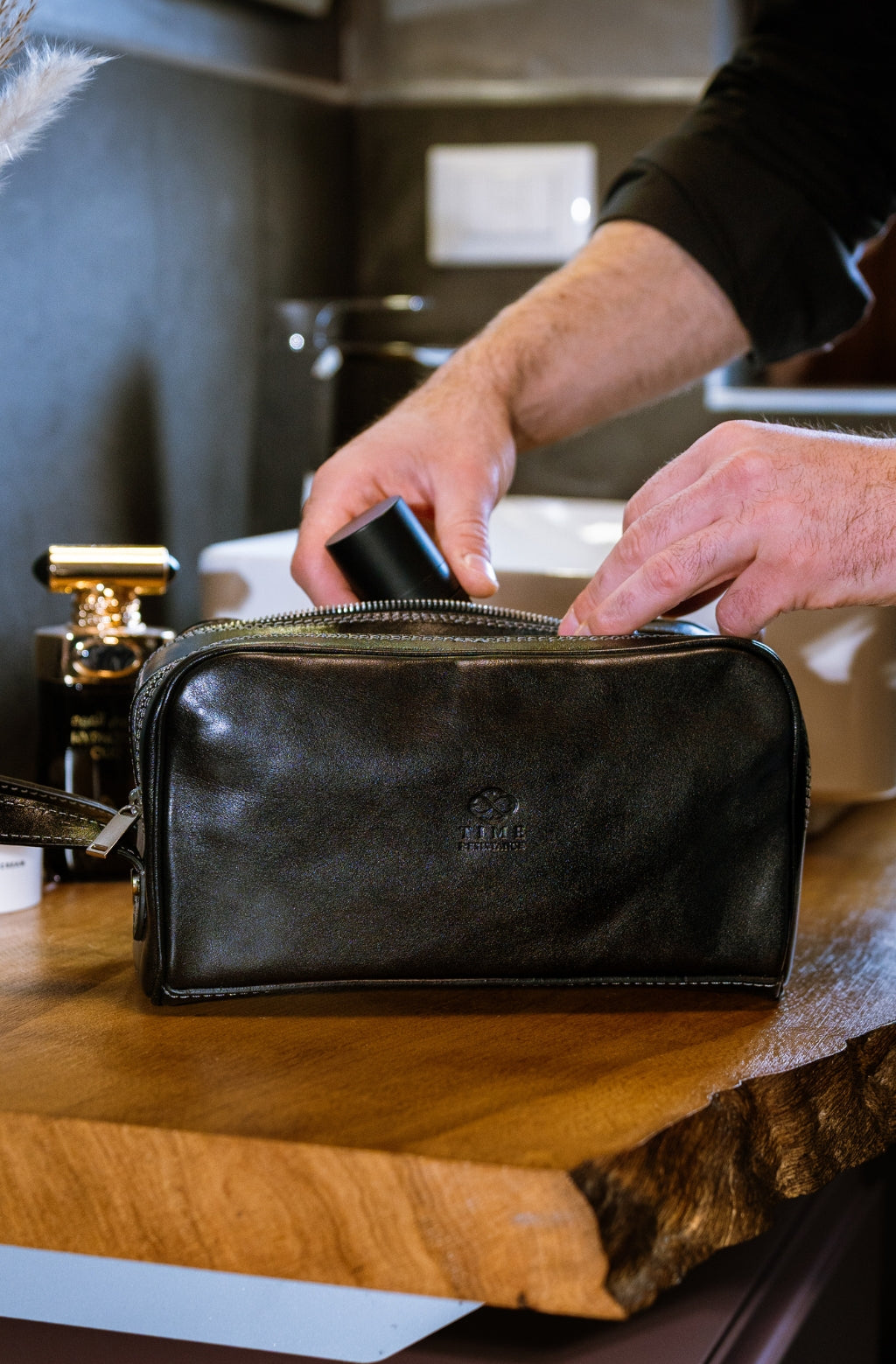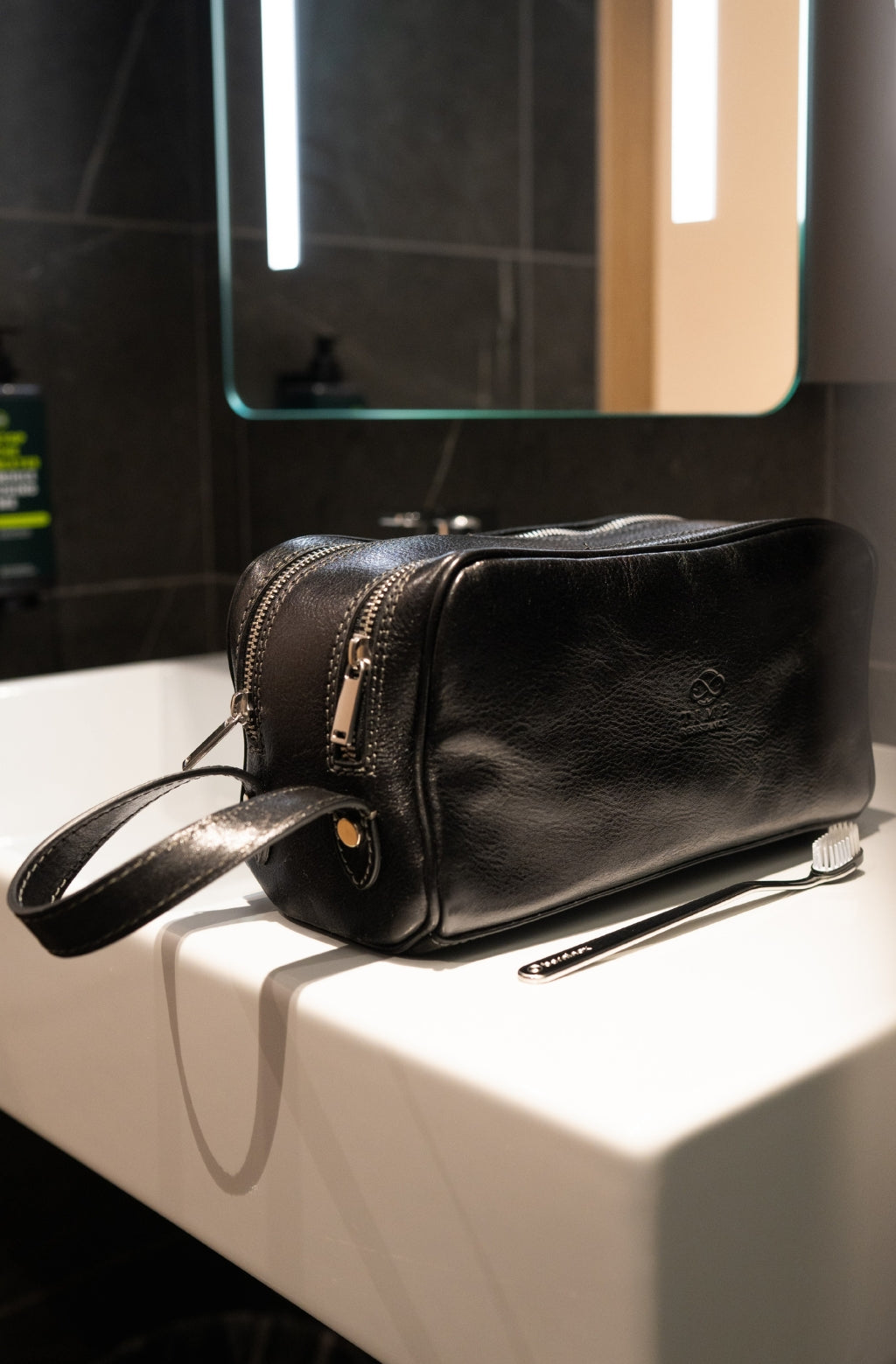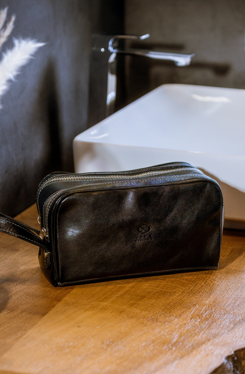 Another perfectly crafted cosmetic/toiletry bag for men (and not only). Two separate compartments are roomy enough to fit everything you need. Two inside pockets to keep things apart from others. Simple and classic design comfortably planned to fit every man's needs.