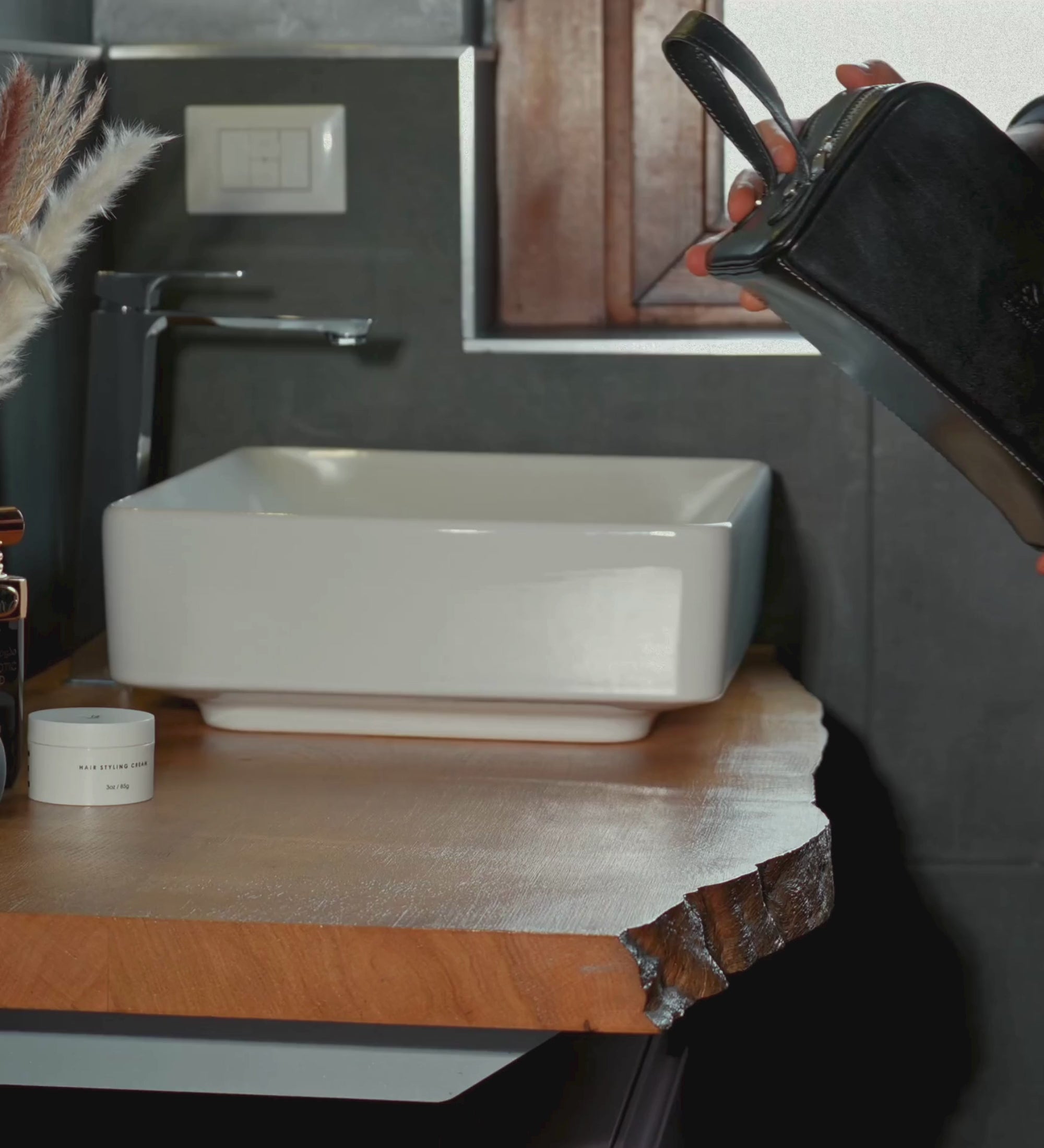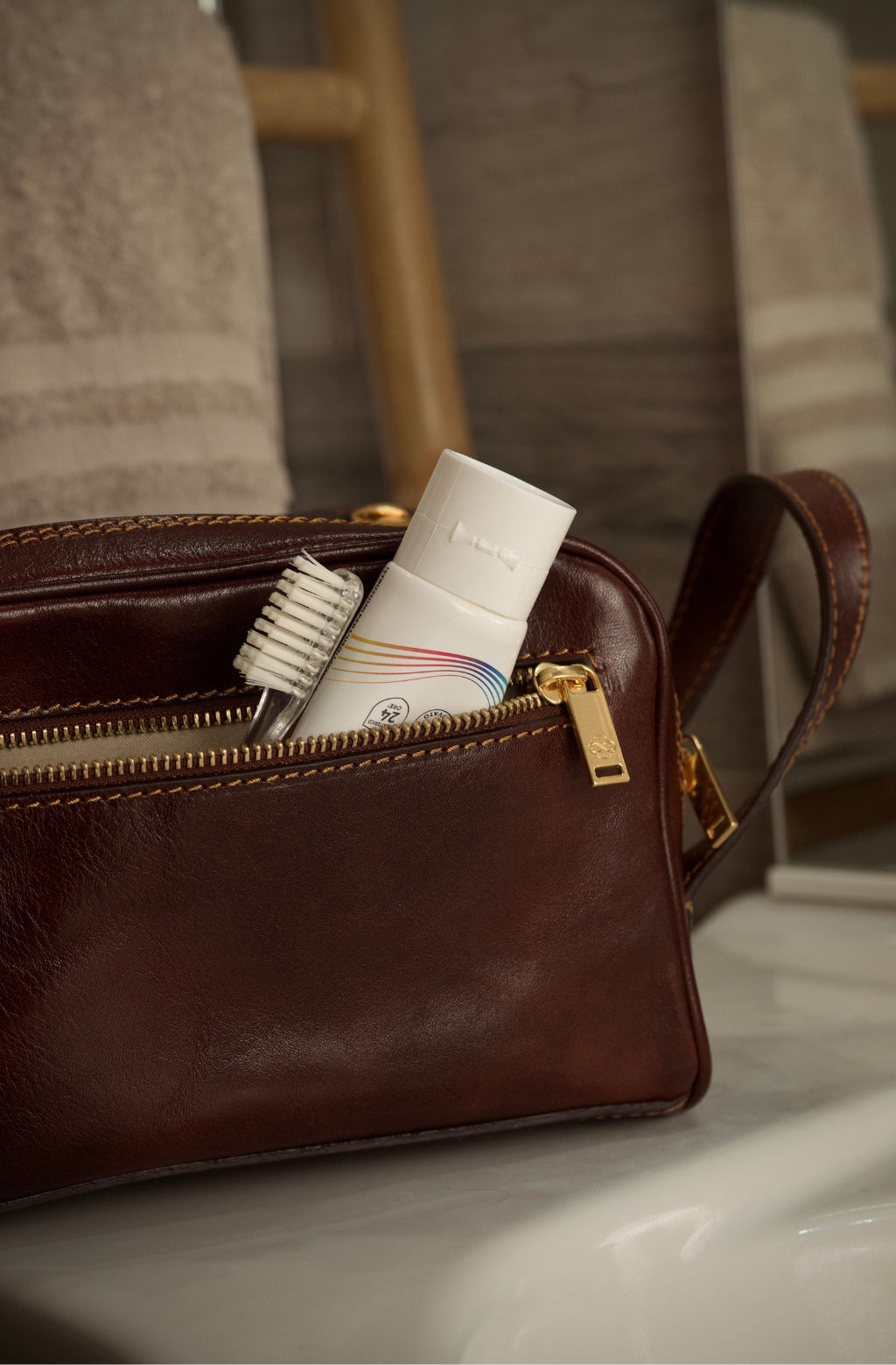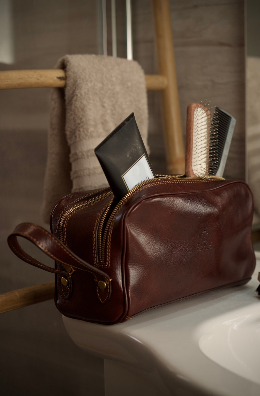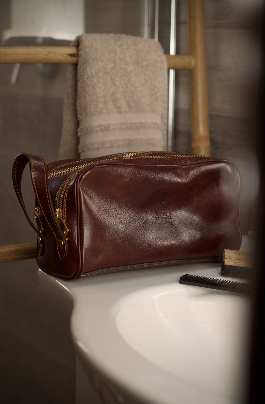 Another perfectly crafted cosmetic/toiletry bag for men (and not only). Two separate compartments are roomy enough to fit everything you need. Two inside pockets to keep things apart from others. Simple and classic design comfortably planned to fit every man's needs.
