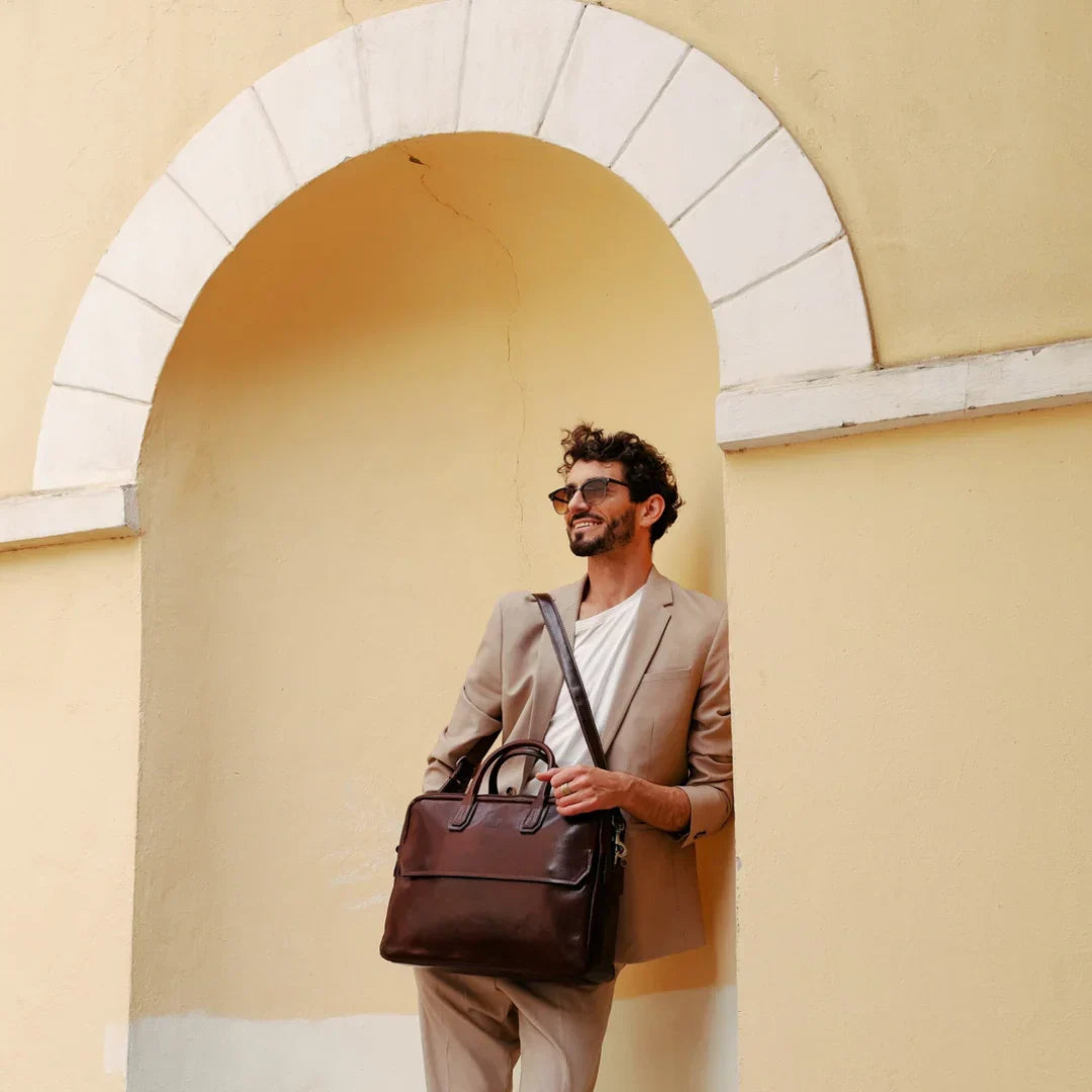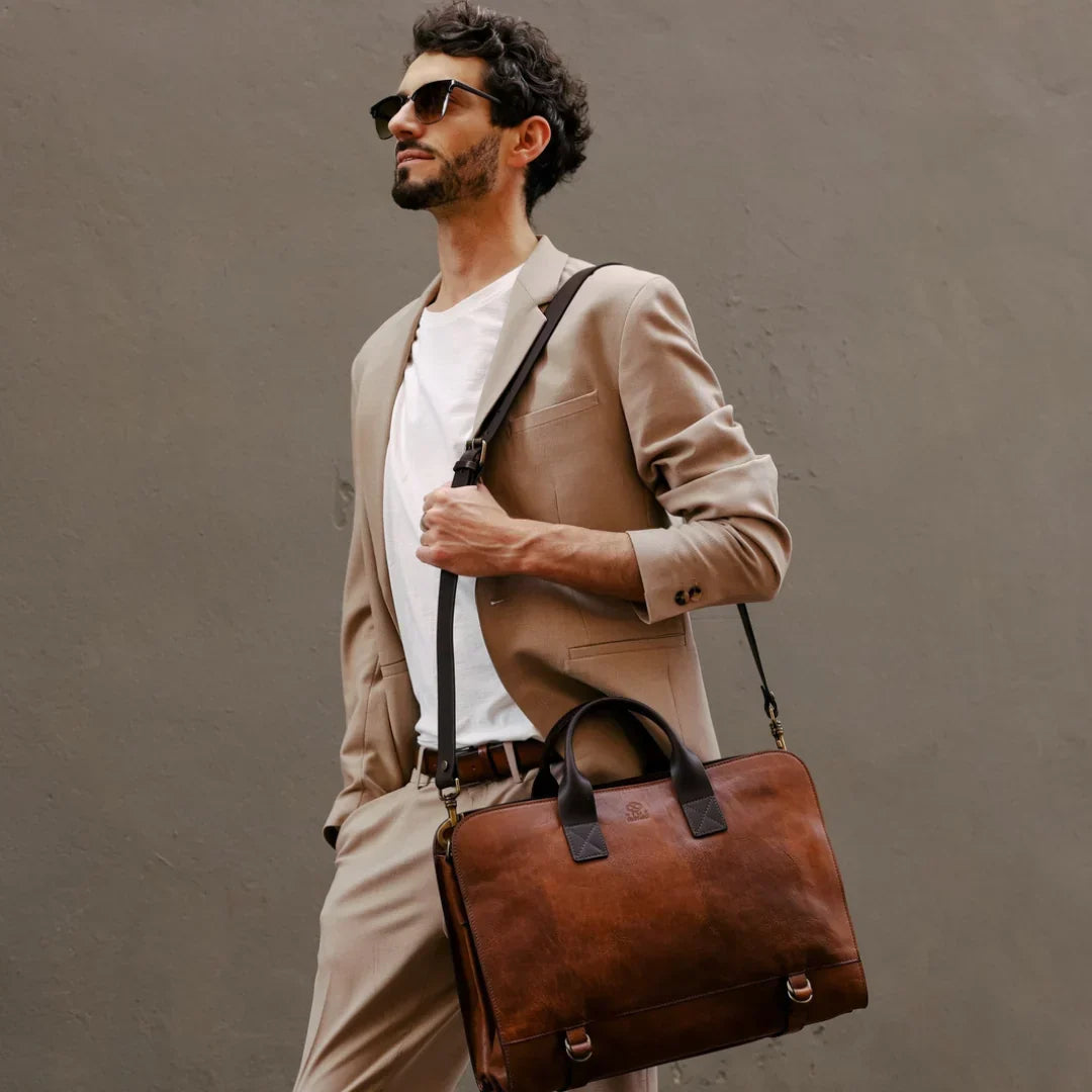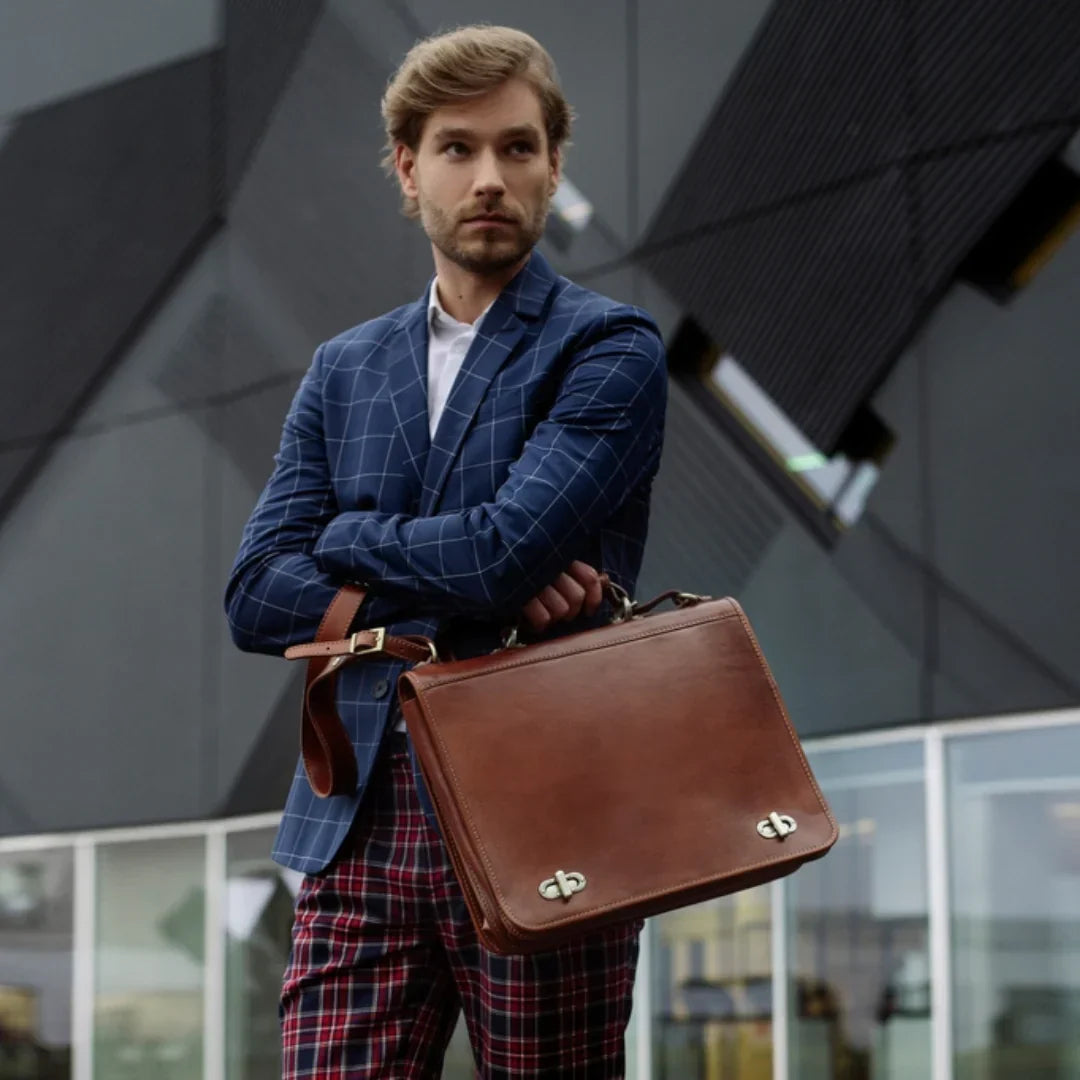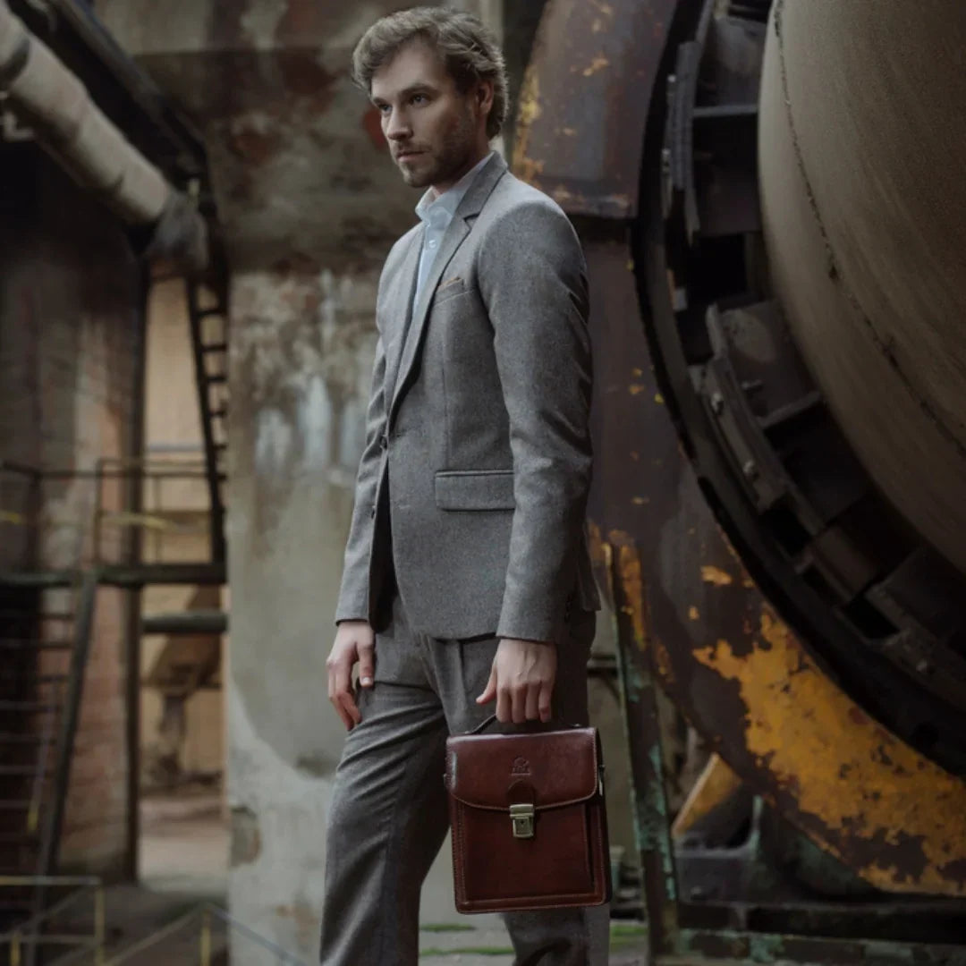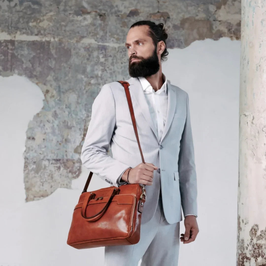 This spring, we invite you to experience a new kind of love: a love between you and your bag. Our latest photoshoot is a tribute to this special bond that transcends time and space. Our leather bags are more than just accessories. They are companions, confidants, and soulmates. They reflect your inner beauty and express your outer style. They are with you through thick and thin, through joy and sorrow, through work and play. They are the ones who make you feel alive and complete. Our photoshoot captures the magic of spring: the freshness of the air, the warmth of the sun, the vibrancy of the city. The model is a vision of elegance and charm, wearing a suit that matches his bags and his mood. The background is a stunning contrast of light and dark, with subtle touches of modernity and history. The photoshoot is a romance between you and your bag. It shows that you don’t need anyone else to make you happy. You just need yourself and your bag. So go ahead and indulge in a spring fling with our leather bags.