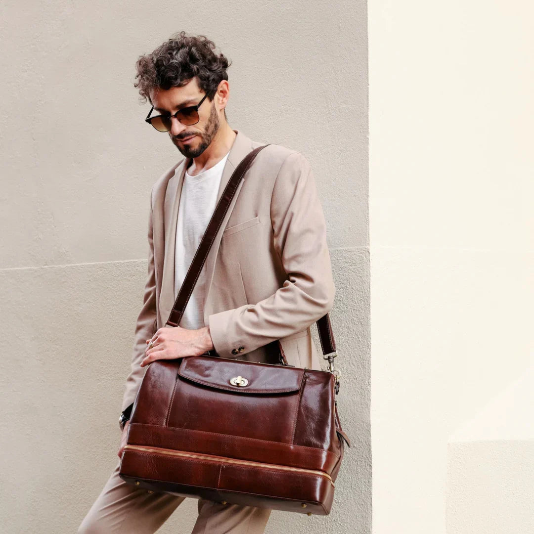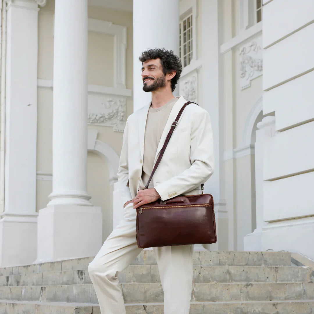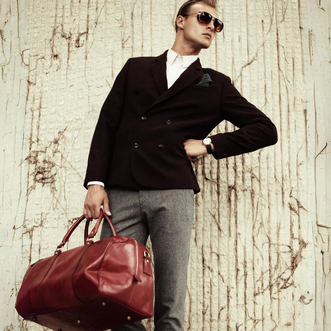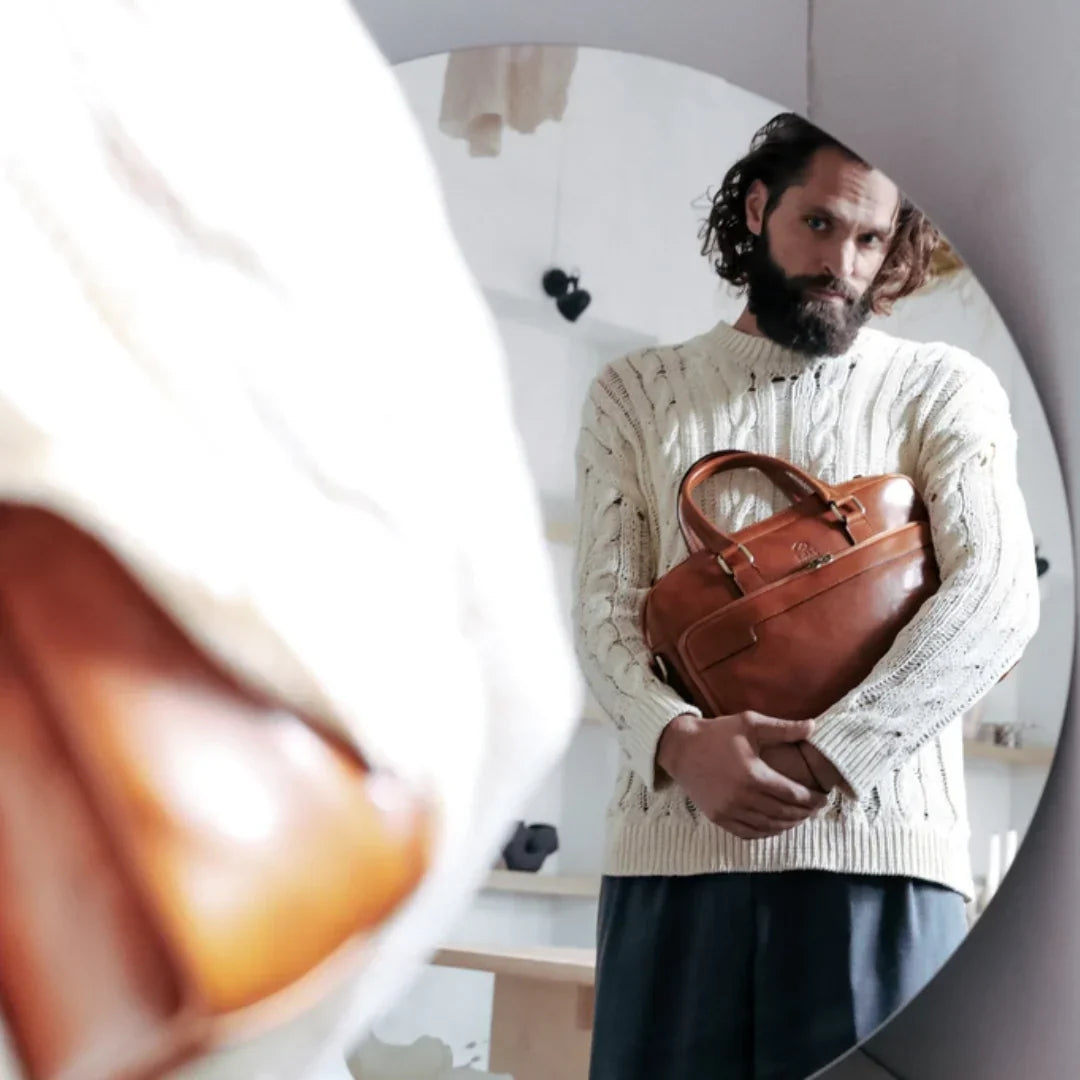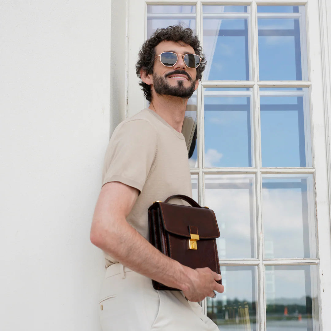 This spring, we invite you to experience a new kind of love: a love between you and your bag. Our latest photoshoot is a tribute to this special bond that transcends time and space. Our leather bags are more than just accessories. They are companions, confidants, and soulmates. They reflect your inner beauty and express your outer style. They are with you through thick and thin, through joy and sorrow, through work and play. They are the ones who make you feel alive and complete. Our photoshoot captures the magic of spring: the freshness of the air, the warmth of the sun, the vibrancy of the city. The model is a vision of elegance and charm, wearing a suit that matches his bags and his mood. The background is a stunning contrast of light and dark, with subtle touches of modernity and history. The photoshoot is a romance between you and your bag. It shows that you don’t need anyone else to make you happy. You just need yourself and your bag. So go ahead and indulge in a spring fling with our leather bags.