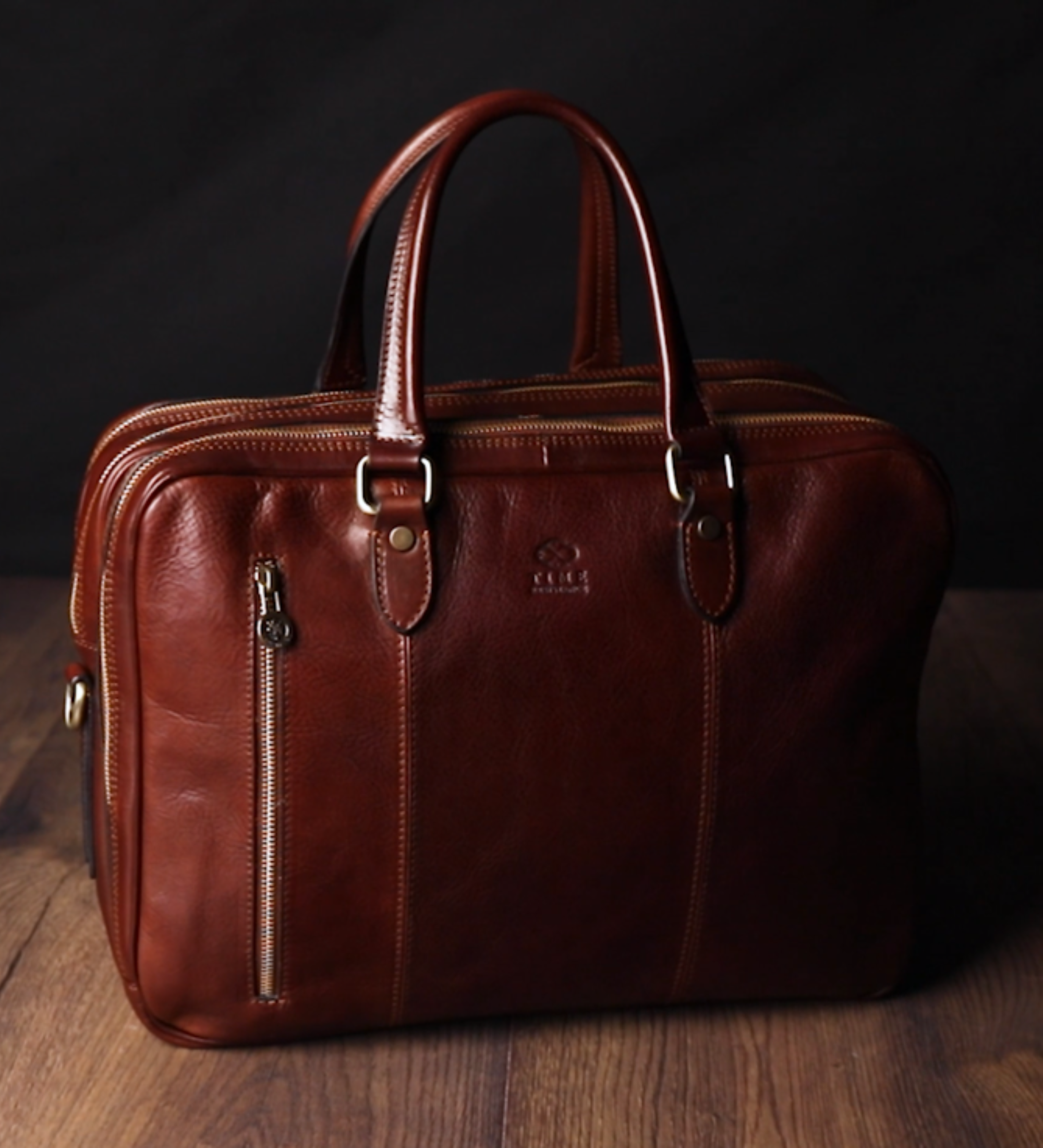 A spacious briefcase for a heavy traveler. This full-grain Italian leather work bag has three compartments and lots of pockets for all your belongings. Carry it in hand, wear it on your shoulder, convert it into a backpack, or use the trolley strap to carry it on a suitcase. Innovative design, premium hand-dyed leather, and clean lines reflect the purpose of this briefcase, which is to make things happen while in style.