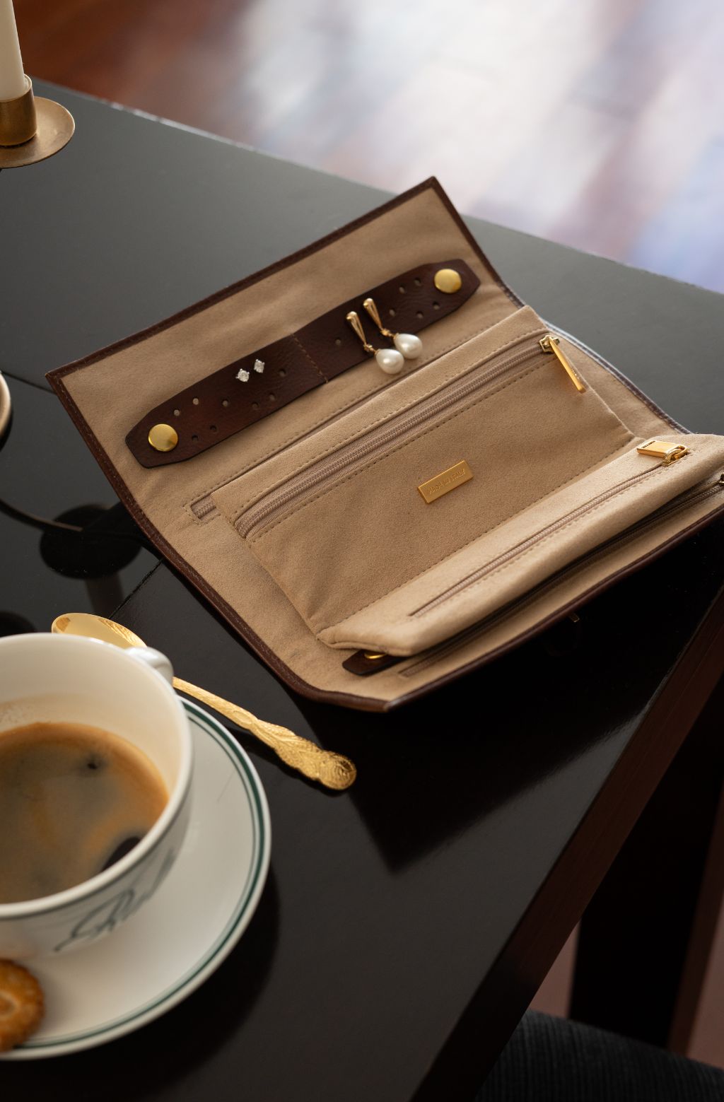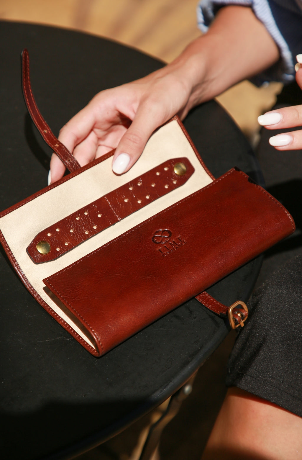 Unroll this leather gem to reveal a haven for your cherished pieces. Thoughtfully designed compartments and pockets cradle your jewelry or cosmetics, ensuring they remain pristine and protected. The Petite Leather Roll Bag becomes your personal treasure chest, safeguarding your valuables with style.