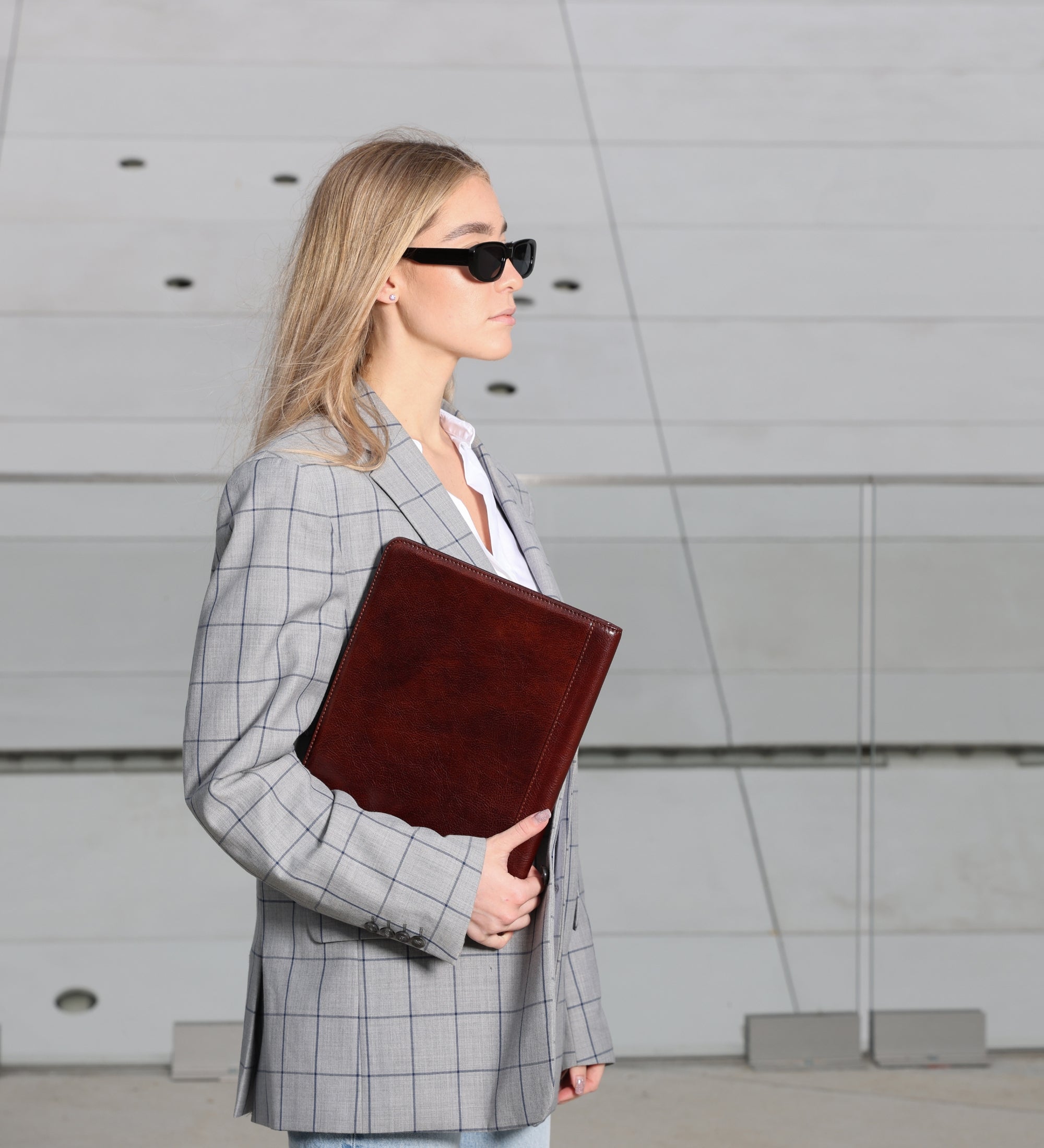 Whether you're preparing paperwork for a high-stakes presentation or safeguarding your tablet for a crucial meeting, this portfolio ensures that you're always prepared to make a lasting impression. Nestled within its sleek exterior is a spacious interior, lined with gentle material that cradles your devices and papers, protecting them from scratches and damage. With multiple pen loops and thoughtful card slots, every detail is carefully considered to streamline your workflow and elevate your organizational prowess. Elevate your professional persona with our Leather Portfolio—the epitome of functionality, and ambition.