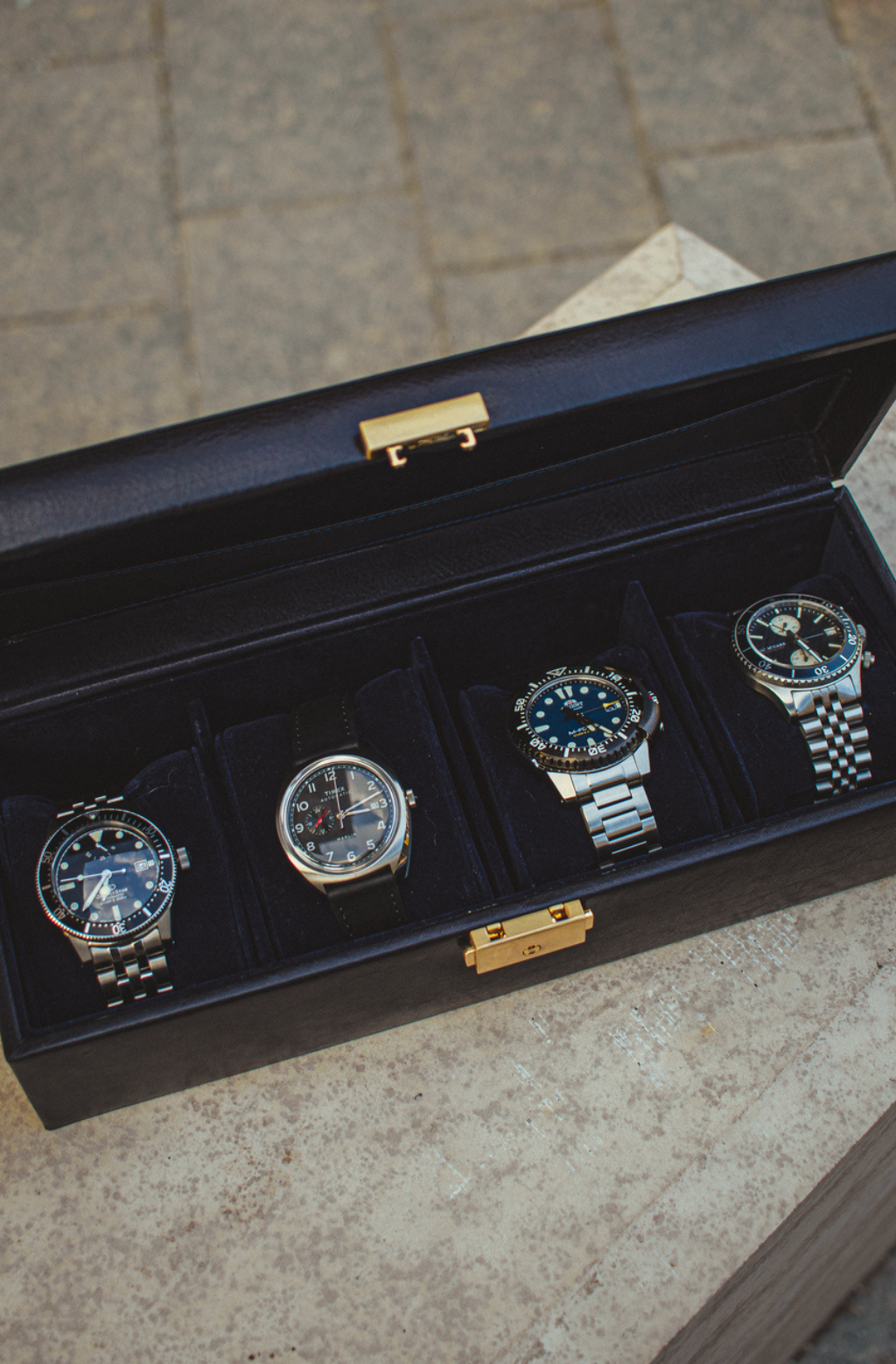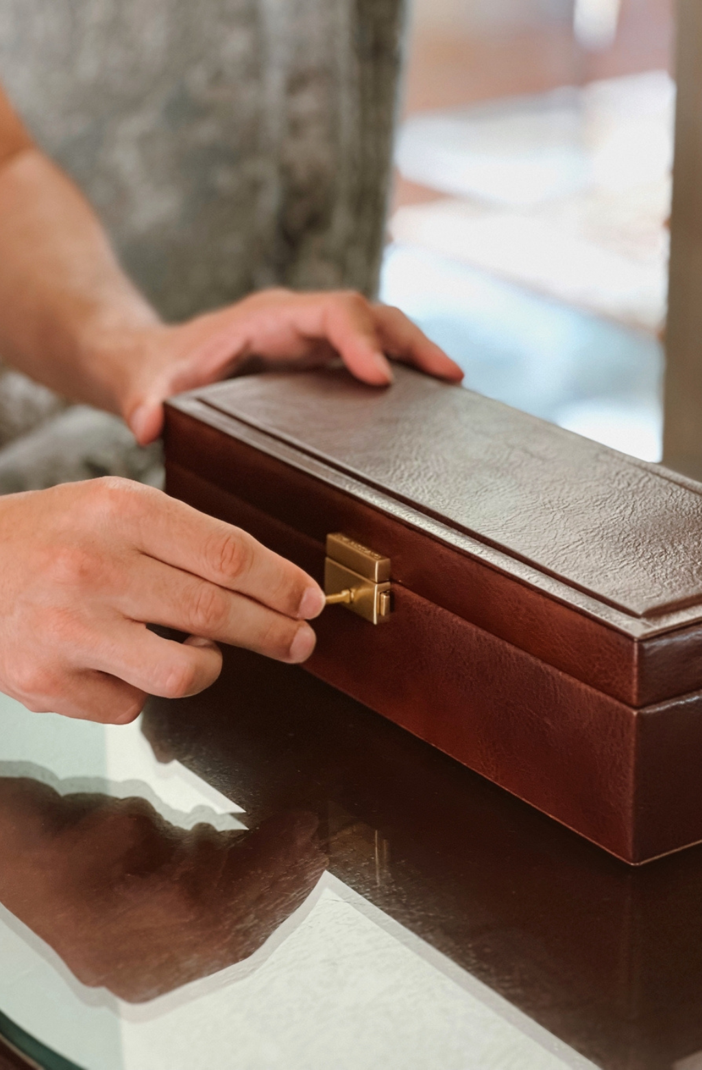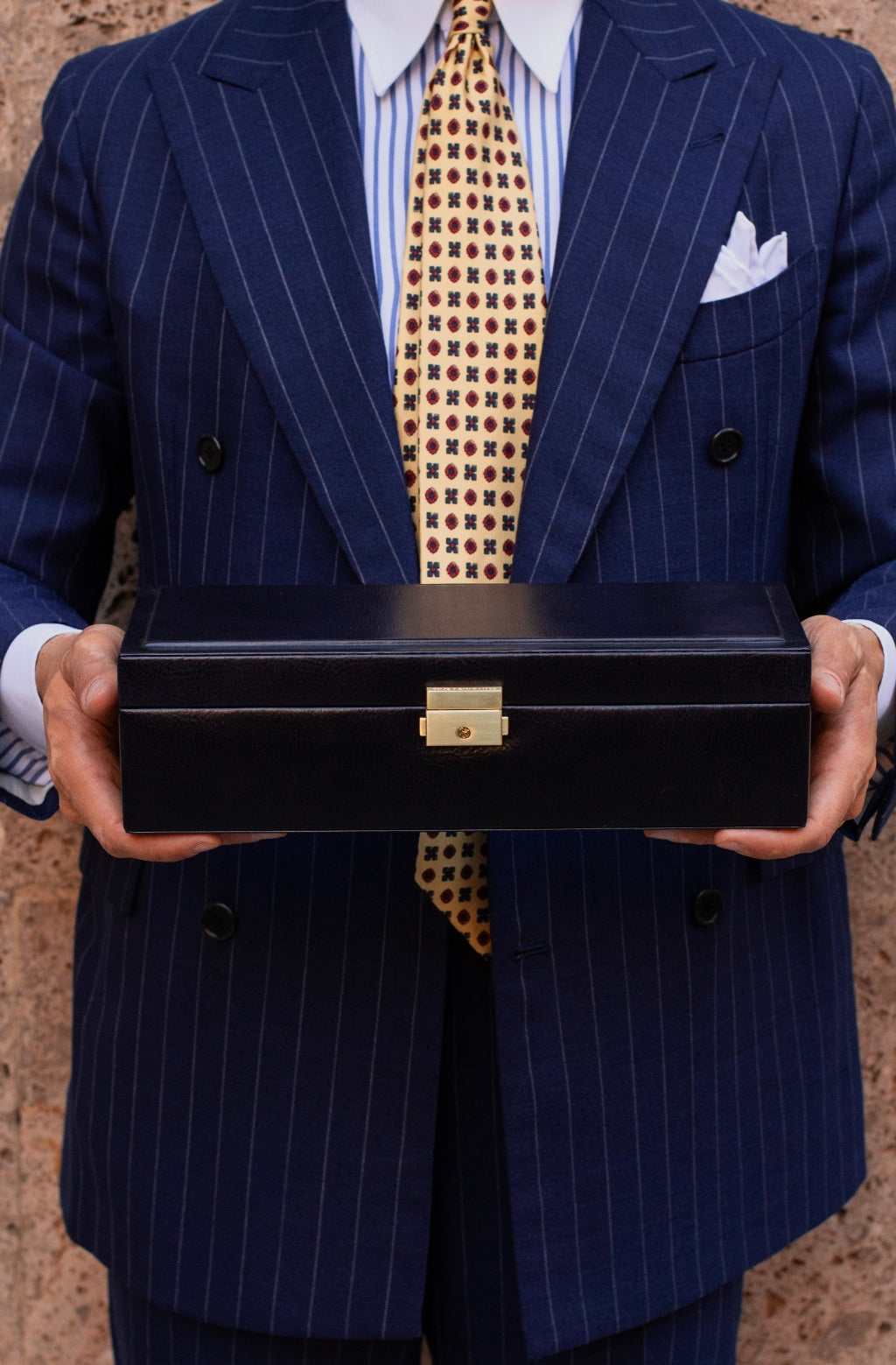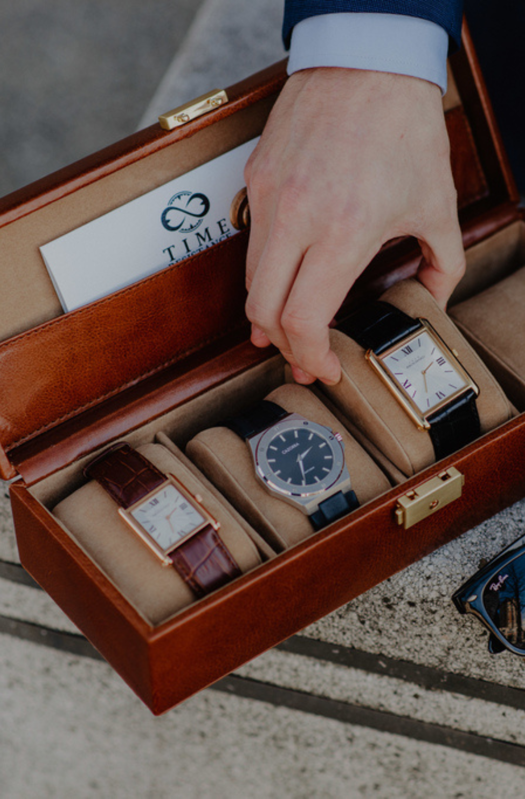 A leather watch box Herzog keeps your timepieces safe and sound. Made of full-grain Italian leather and extra soft velvet, this organizer has slots for four watches. A leather pocket is perfect for storing several watch straps or bracelets. A luxury watch holder can be a stylish accessory on a dresser or it can protect your precious collection of wristwatches while travelling. The box can be personalized with the initials of your loved one or even your favorite quote.