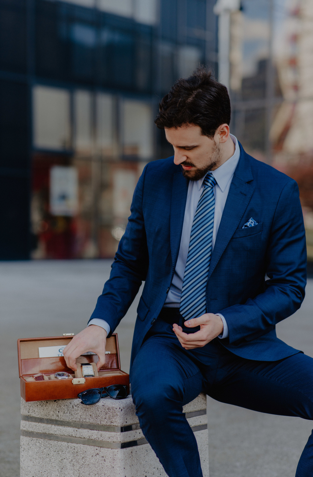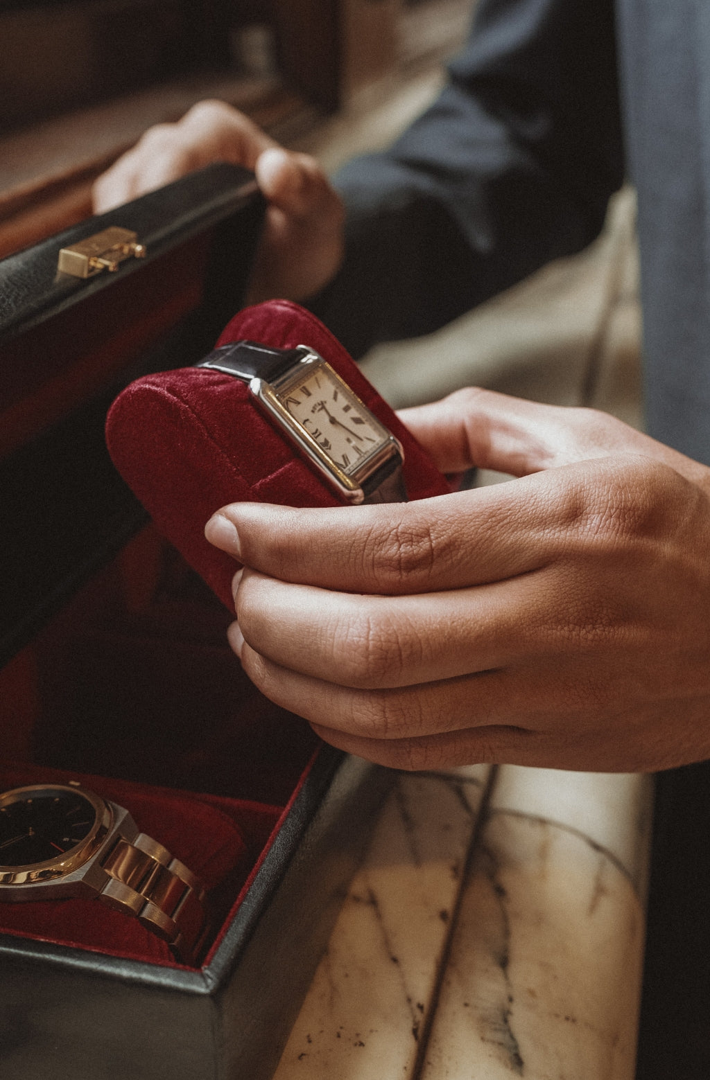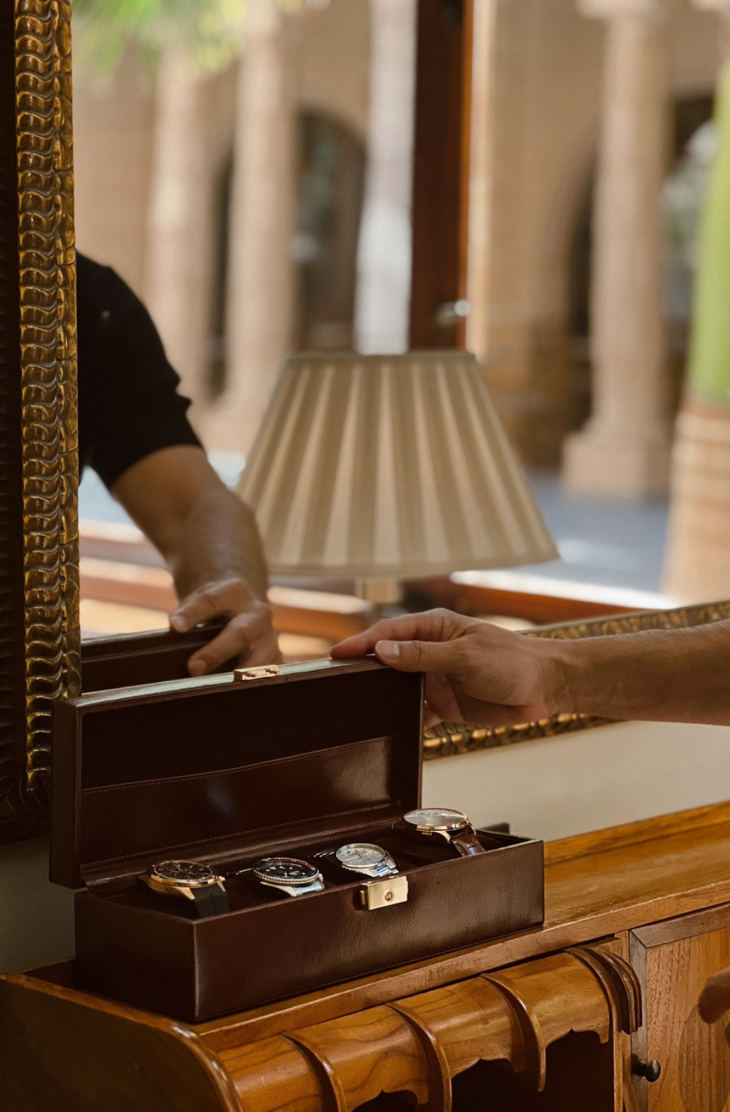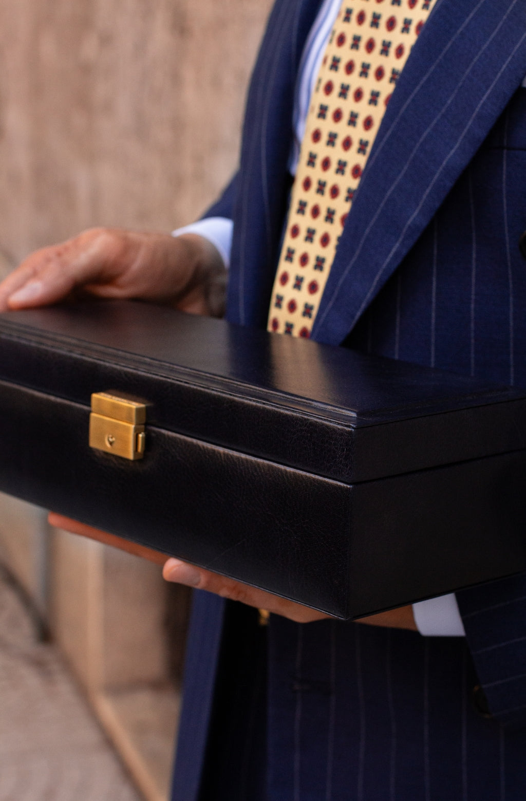 A leather watch box Herzog keeps your timepieces safe and sound. Made of full-grain Italian leather and extra soft velvet, this organizer has slots for four watches. A leather pocket is perfect for storing several watch straps or bracelets. A luxury watch holder can be a stylish accessory on a dresser or it can protect your precious collection of wristwatches while travelling. The box can be personalized with the initials of your loved one or even your favorite quote.
